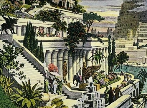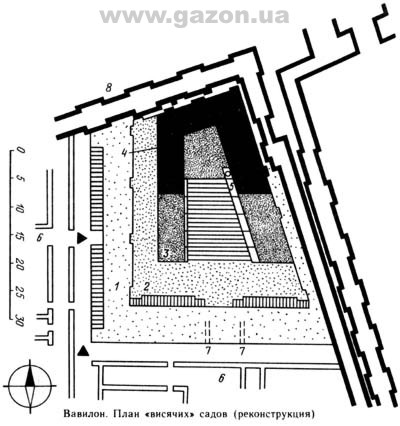 Особой известностью пользовались «висячие сады» Семирамиды, созданные во дворе Южного дворца (605-562 гг. до н.э.), которые расширил и возобновил Навуходоносор II. На основании археологических материалов учеными представлены гипотетические варианты садов Семирамиды. Согласно этим данным, сады (точнее сад) представляли собой ряд возвышающихся террас - отсюда, вероятно, и множественное число «садов», принятое в древних описаниях. Сад примыкал к северо-восточному углу городских стен, а своей южной частью выходил к дворцовым покоям. Он был устроен в виде четырех ступенчатых, сужающихся кверху террас (по некоторым исследованиям, число террас было больше) Нижняя размером 45Х40 м имела высоту 8 м, вторая - 40Х30Х13 м, размеры двух других террас неизвестны. Это садовое сооружение достигало уровня городской стены. Слой земли на первых двух террасах составлял 2 м, на следующих - 1 м. На нижних террасах росли деревья, на верхних - кустарники и цветы.