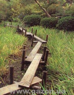 Дерево. Деревянные мостки или дорожка привнесут в оформление сада свой колорит. Для дорожки можно использовать поперечные срезы стволов деревьев, доски, бревна или чурки. Если Вы остановили свой выбор на спилах толстых стволов или бревнах, то используйте древесину, очищенную от коры, дабы дерево не слишком быстро сгнило. И помните, что в дождь дерево может стать скользким, особенно если его поверхность круглая. Хорошо, если деревянный строительный материал был предварительно обработан - обструган и пропитан специальным составом.