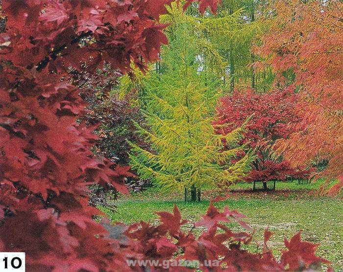 Для начала как следует изучите огромный выбор сортов, специально выведенных для кислых почв. В малых садах грядки можно сделать в тени. Они могут быть заняты некоторыми лесными видами, например триллиумами, Meconopsis, Singuinatia и Paris. Они могут быть смешаны с папоротниками, некоторыми сортами луковичных, вечнозеленым кустарником, например, Destfontainia spinosa, и карликовыми рододендронами. Лилии же, например, стремятся к солнцу, а в каменистых садах прекрасно живут горечавка и астры. В больших садах выбор просто огромен. Такие деревья как японские клены (рис. 10) и магнолии, кустарники, как, например, кизил, пиерис будут процветать на кислых почвах.
