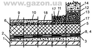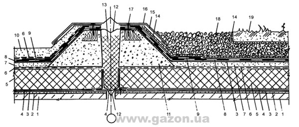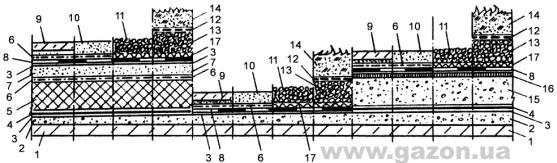 1-5. Проблема использования эксплуатируемых кровель зданий и сооружений для создания на них архитектурно-ландшафтных объектов до последнего времени упиралась в трудности освоения подземного пространства при строительстве подземных гаражей и практическую невозможность предотвращения протечек покрытий при использовании традиционных кровельных материалов, а также проблему создания устойчивого противокорневого слоя при использовании тех материалов, которыми располагали строители.