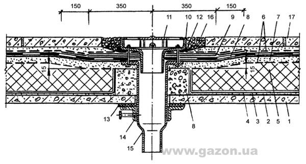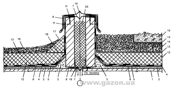 2-2-4. Система отвода атмосферных осадков является необходимой при устройстве крыш любой конструкции, в том числе и при размещении на искусственных основаниях любых архитектурно-ландшафтных объектов. Для удаления дождевой влаги или излишней воды при поливе озелененных поверхностей используют дренажный слой, который укладывается над гидроизоляцией, по которому вода стекает в специальные дождеприемники.