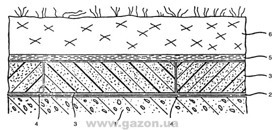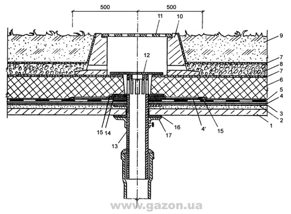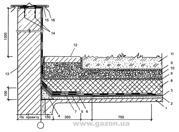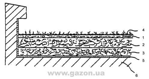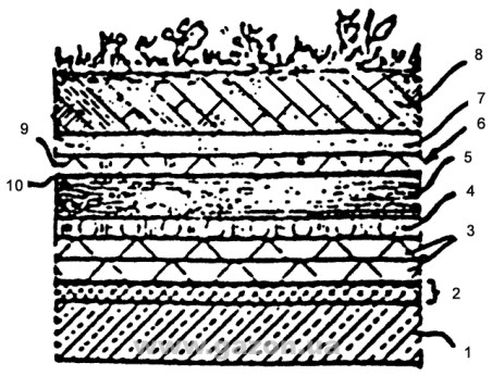 При озеленении плоских крыш предусматривается наличие следующих слоев: изолирующего от прорастания корней, дренирующего слоя, водопроницаемого разделительного слоя и растительного слоя; предусматривается их простейшее устройство при повышенной способности к накоплению влаги. Дренирующий слой составляется из подготовленных плит из комбинированных шлаков со специфической объемной массой 80 - 120 кг/м3. Дренирующий слой покрывается разделительным, представляющим собой подходящие нетканые материалы.