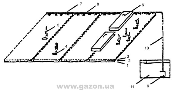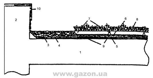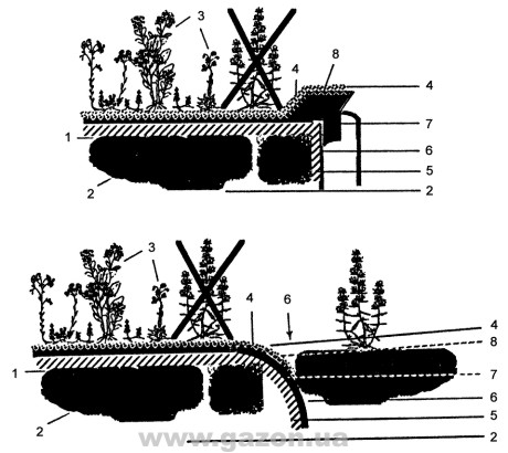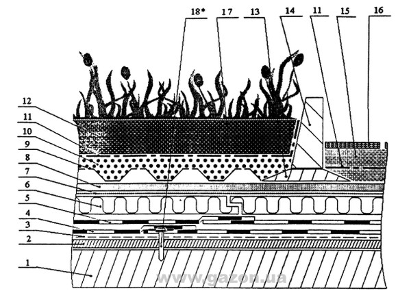 В корнеобитаемом слое 2 размещена система снабжения растений водой в виде распределительного трубопровода 7 и форсунок 8, которые соединены с резервуаром воды 11 через насос. Регулирование системы обеспечивает наличие в корнеобитаемом слое 2 постоянной водной пленки. В системе снабжения растений водой может использоваться дождевая вода с крыши. Слой 2 защищен панелями 6 (их массой) от сноса ветром.