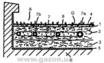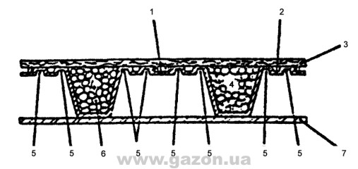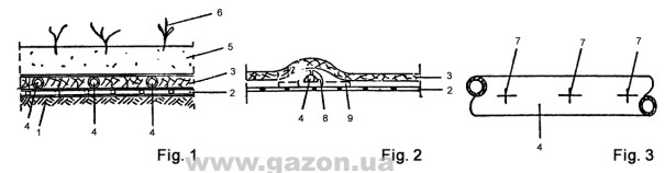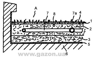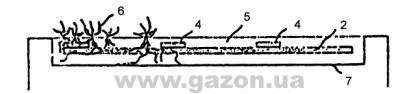 Питательный грунт состоит из слоя 1 для выращивания растений из семян. Верхняя часть этого слоя имеет среднюю плотность. Под слоем 1 для выращивания растений расположен слой 2, который обладает высокой влагоудерживающей способностью и создает благоприятные условия для развития и защиты корней растений. Средняя часть этого слоя имеет большую плотность волокна. Затем расположен водопропускающий слой 3. Этот слой обладает низкой влагоудерживающей способностью и служит для удаления лишней влаги из грунта, например, дождевой воды. Внутри грунта в горизонтальном направлении проложен трубопровод 7 для горячей воды. На самом верхнем слое питательного грунта размещена сетка 4 из синтетической смолы. Питательный грунт предусматривает наличие в нижнем слое грунта мата 5 из синтетической смолы, который не пропускает воду и служит противокорневой защитой.
