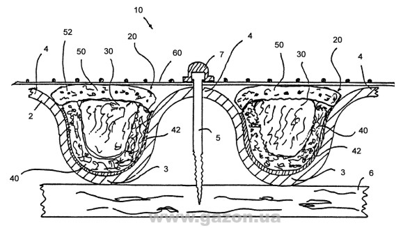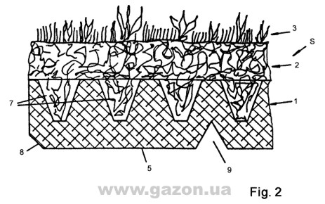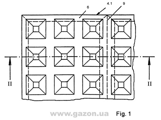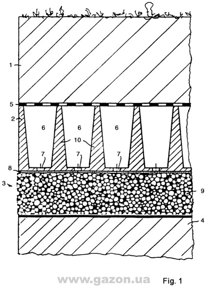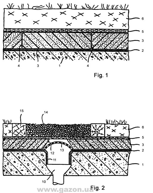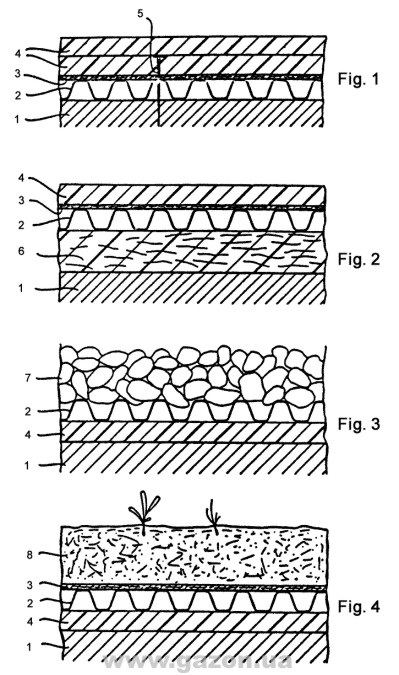 Согласно патенту Германии несущий слой для озеленения крыш выполнен в виде полимерной пленки с водосточными отверстиями, которая покрыта сверху фильтрующим матом. В пленке путем глубокой вытяжки первые 4 и вторые 5 соответственно верхние и нижние углубления. При этом верхние углубления смещены в сторону относительно нижних углублений. Первые углубления полностью заполнены прочным на сжатие сыпучим материалом. Первые и вторые углубления 4, 5 имеют чашеобразную форму. Водосточные отверстия 1 смещены в сторону относительно углублений 4, 5. Фильтрующий мат 3 неподвижно закреплен на направленных вверх донышках углублений 5.