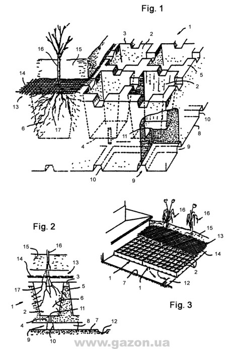 Согласно заявке почвонесущая система для озеленения образуется желобами, принимающими землю, и держателями, несущими эти желоба. Материалом желобов могут быть синтетический материал, металл, минеральный материал с покрытием для защиты от гниения или стойкая к гниению ткань или нетканый материал (синтетический материал, стекловолокно и др.) с частичным покрытием. Свойства материала: нейтральность к растениям, долговечность, коррозионная стойкость и огнестойкость. Вставные полосы могут быть выполнены также из этих материалов или из дерева. Способы изготовления желобов: непрерывное литье, штамповка/резка и закатка/гибка плоских полос (ткани, листовой металл, синтетический материал). Дно всех желобов перфорировано, а фронтальные стороны могут содержать дополнительные элементы, выполненные штамповкой, для вентилирования и прорастания. Желоба из стеклоткани остаются в соответствующих местах без покрытия. Системы желобов, облицовывающие стенки, имеют более высокие перекрывающие задние стенки. В случае использования крюкообразных держателей, у которых точка прикрепления ближайшего нижнего держателя расположена над верхней кромкой желоба, желоб имеет прямую верхнюю кромку задней стенки. При применении крюкообразных держателей, у которых точка прикрепления ближайшего нижнего крюка расположена на одной высоте с дном выше установленного желоба или еще ниже, необходимы вырезы на верхней кромке задней стенки желоба, обеспечивающие перекрытие задних стенок. Держатели могут быть выполнены заодно с желобами благодаря тому, что профили крюка, проходящие горизонтально на задней стороне желоба, входят один в другой, или горизонтальные ряды крюков, отогнутых от задней стенки желоба, входят в соответствующие прорези в задней стенке желоба.