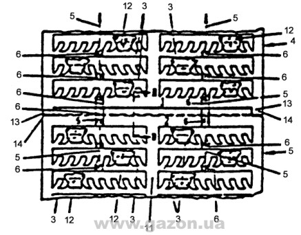 На перегородках выбраны пазы канальной формы, проходящие через всю их ширину, а на одном конце перегородки или на внешнем конце соответствующей перегородки имеют пазы по размерам, соответствующим половине сечения каналов.