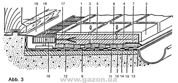 Высокопрочные несущие плиты для субстрата изготавливаются из водонакопительных ванн из пенопласта. Эти ванны разделены промежуточными перегородками одинаковой высоты на равные зоны. Кроме того, в этих зонах предусмотрены водоотводящие каналы, соединенные с сетью мелких каналов.