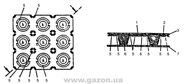 Маты для озеленения, дренажа и обеспечения подпора воды служат для озеленения крыш, обеспечения дренирования и подпора воды. Маты изготавливаются из профильных высокопрочных полимеров. Они используются в качестве водоотводящей и орошающей подосновы для устройства озеленения крыш. Благодаря их многоканальной профильной конструкции образуются разделенные между собой подпорные камеры 1, в которые собирается дренирующая влага. На перегородках наклеена геотекстильная ткань 4, чтобы пустоты не заполнялись верхними слоями субстрата. Подпор воды внутри соединенных между собой подпорных камер осуществляется таким образом, что созданный растительный слой озелененной крыши сохраняется длительный период.