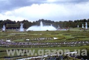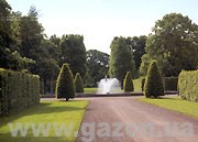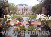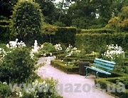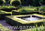 Партерная часть сада оформлена изысканными цветниками с использованием цветного песка, гравия, украшена скульптурами и декоративными вазонами.