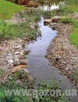 Ручей представляет собой неширокий поток воды, имеющий извилистое русло, приближающееся к природным аналогам. Перед началом проектирования желательно выбрать тип течения применительно к имеющимся условиям. На ровной горизонтальной поверхности обычно устраивают поток равнинного типа, имеющий очень извилистое русло, пробивающееся через влаголюбивую растительность. На участке с уклоном закладывают горный ручей с каменистым ложем, падающего каскадом с небольших уступов и прерываемого тихими заводями. Изменение уклонов на пути движения ручья является очень эффективным приемом приближения к природным аналогам, при этом нужно помнить, чем круче уклон, тем уже русло и наоборот. Источником начинается любой ручей, но можно спроектировать источник в чистом виде, при условии отвода собирающейся воды. Оформление их очень многообразно, начиная от каменных скульптур и масок, с вытекающими из них струями, до круглых выложенных булыжниками площадок с пробивающимися в центре ключами.
