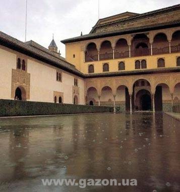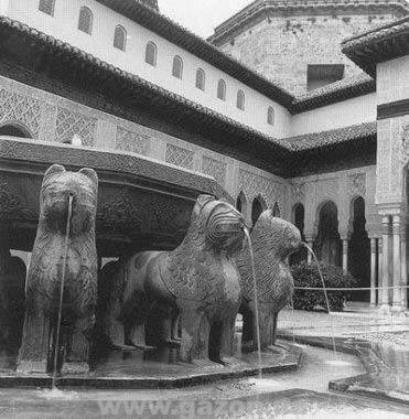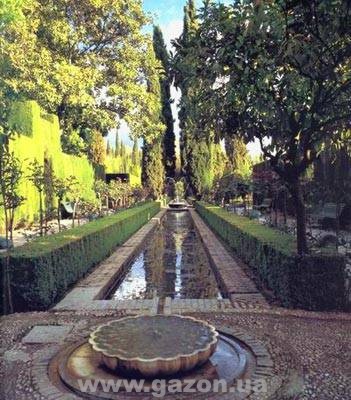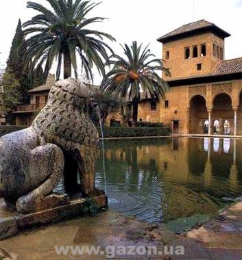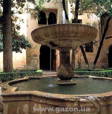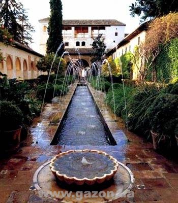 Во Дворе Львов в Альхамбре кажущаяся простота водных элементов контрастирует и, одновременно смягчает эффект от окружающих величественных построек.